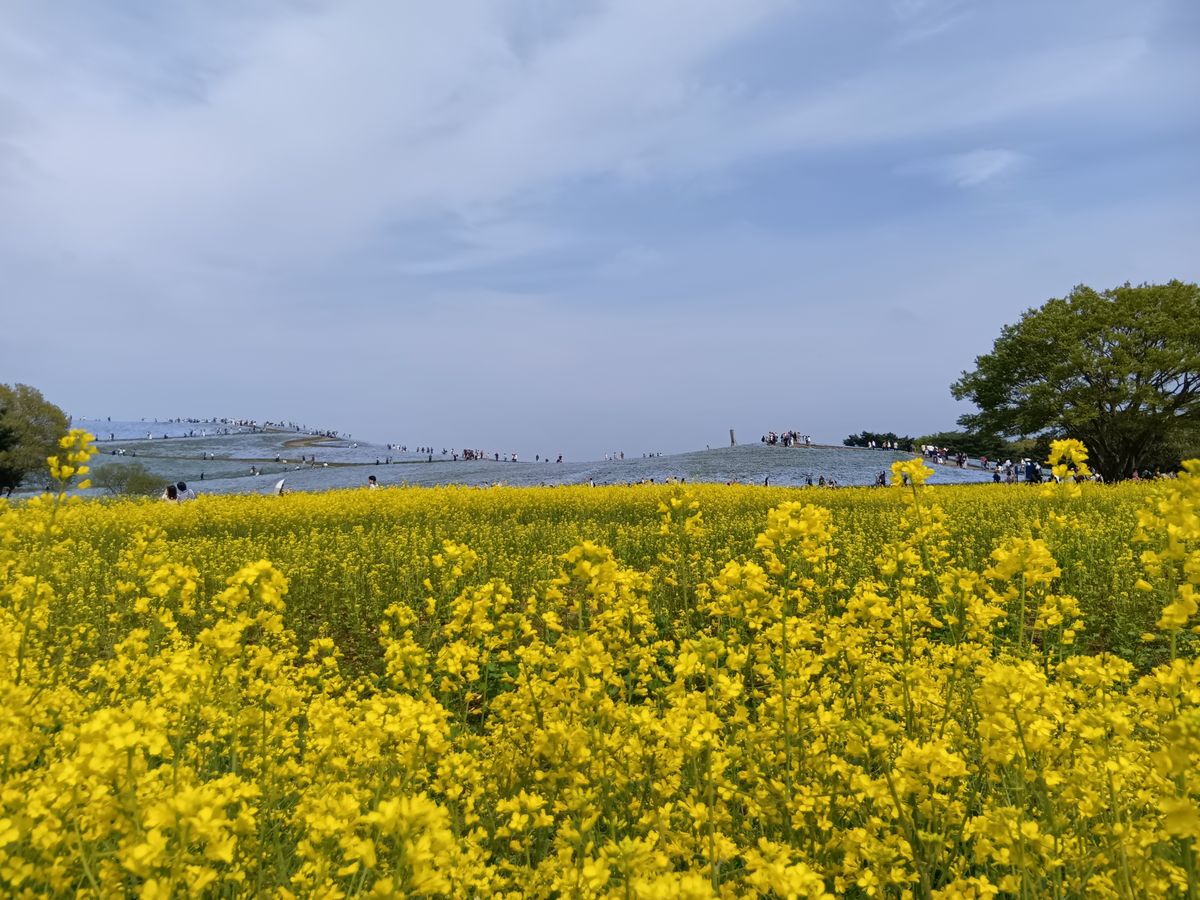 広い空と海、ネモフィラの丘は青の世界に満ちている。そして、その下には、菜の花が陽光を浴びて黄色に輝いていた。