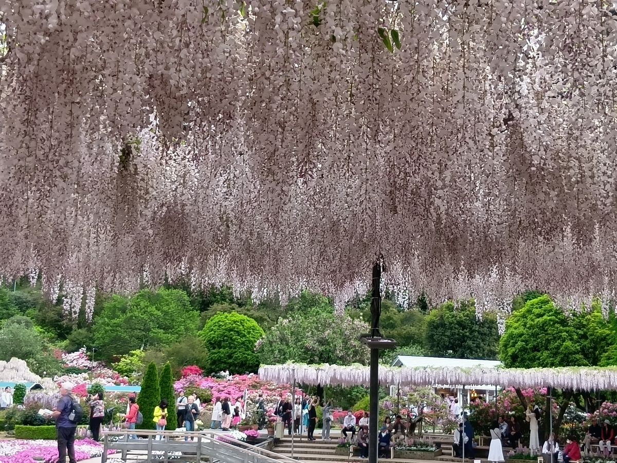 ネモフィラがやや終わりかけの5月11に行きました。ネモフィラが目的の方はもっと早めがいいでしょう。一方であしかがフラワーパークはバラが見頃でとても華やかでした。大藤は終わりの季節でしたが、私はあしかがフラワーパークの大藤は以前見たことがあるのでバラの季節に行けて良かったです。大藤の季節は幻想的なのですが、庭園の一部なのでバラの季節のほうがパーク全体が華やいで楽しめます。パークの佐野ラーメンも美味しくておすすめです。個人で行くと大変な日程なので両方効率よくまわるには良いツアーでした。