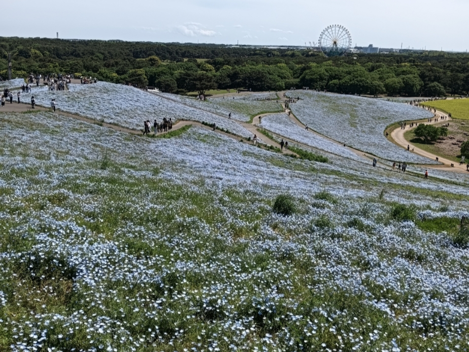 ひたち海浜公園はとても混雑していましたが、ネモフィラがほぼ満開でお天気にも恵まれたため、青空とネモフィラが一体化しているような素晴らしい景色を楽しむことができました。