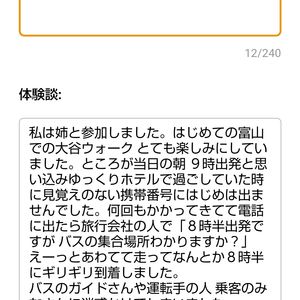 私は姉と参加しました。はじめての富山での大谷ウォーク とても楽しみにしていました。ところが当日の朝 9時出発と思い込みゆっくりホテルで過ごしていた時に見覚えのない携帯番号にはじめは出ませんでした。何回もかかってきてて電話に出たら旅行会社の人で「8時半出発ですが バスの集合場所わかりますか?」