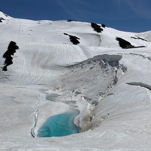雪解け水の滝を従えた称名滝、まだまだ十分な迫力の雪の大谷、空飛ぶ雷鳥、水面が見え出したみくりが池などなど、この時期しかできない貴重な体験をさせていただきました。