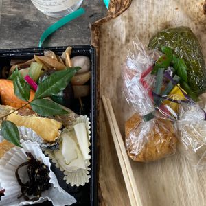 お昼は熊野古道弁当をいただきました。熊野の郷土料理の「めはりずし」や五穀米のおにぎりが入った4種のおにぎりと季節の野菜や新鮮な食材で丁寧に作られた田舎料理が詰まったとても美味しいお弁当でした。