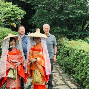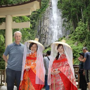 80歳になる叔母が7年ぶりに帰国し、私の住む和歌山に遊びにきてくれました。和歌山の名所をめぐり、私と叔母の2人で平安装束体験にチャレンジ。一緒にきたスコットランド人の叔父も喜んででくれました。楽しく衣装を選んで着付けていただき、那智の滝まで車で移動して撮影。良い記念になりました。
