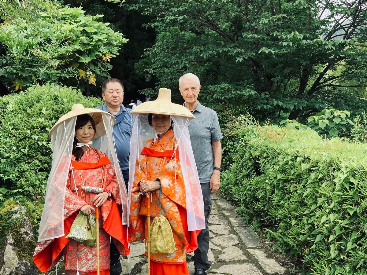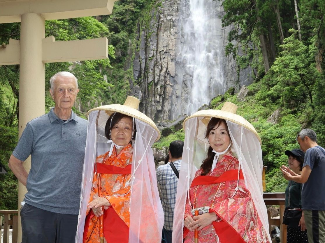 80歳になる叔母が7年ぶりに帰国し、私の住む和歌山に遊びにきてくれました。和歌山の名所をめぐり、私と叔母の2人で平安装束体験にチャレンジ。一緒にきたスコットランド人の叔父も喜んででくれました。楽しく衣装を選んで着付けていただき、那智の滝まで車で移動して撮影。良い記念になりました。