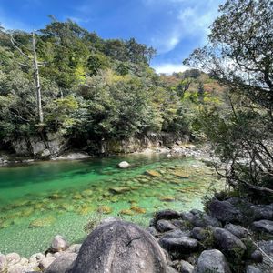 巨石ごろごろ エメラルドグリーンの川