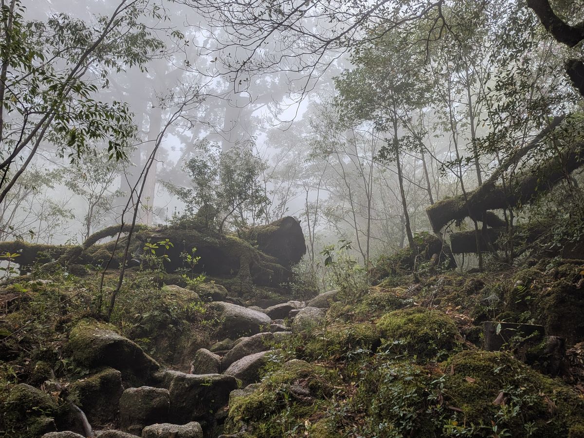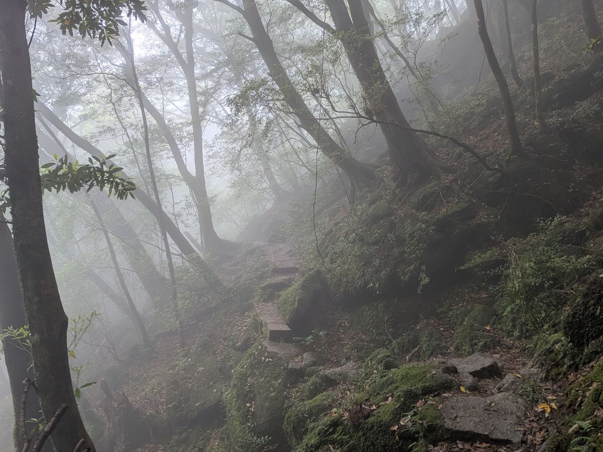 残念なことに頂上は真っ白で何も見えなかったけど、下山中は濃霧のお陰でとても神秘的で不思議な世界に入り込んだ感覚になりました。