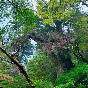 晴天のトレッキング、青空バックと新緑に囲まれた縄文杉をみていだけて