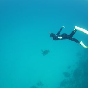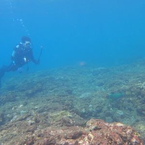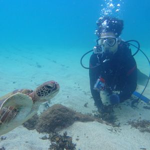 シュノーケリングよりダイビングは難しいと思っていたので、うまく泳げるかどうか心配でしたが、耳抜きや呼吸法など、基礎的なことをていねいに教えてくださったので、初めてのダイビングで50分間潜ることができました。またあんなに近くでウミガメやウツボの動画をとることができるとは思っていなかったので、最高の経験ができました。