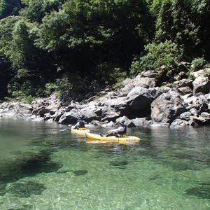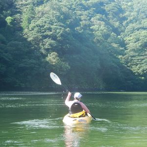 雨予報でしたが幸い晴れ間もあり、キラキラ光る照葉樹や水面を見ながら涼しくカヤックを楽しめました。蝶やサワガニ、猿にも会えました!