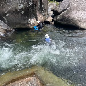 前日の雨で増水していたこともあり川の流れが強く催行も危ぶまれましたが、経験豊かな田脇さんのおかげで安全にワクワクドキドキを体験させてもらいました。岩からの飛び込みや、岩場の探検、頑張って川の流れに逆らって泳いだりして到達した最後の秘境の滝は感動の一言です。