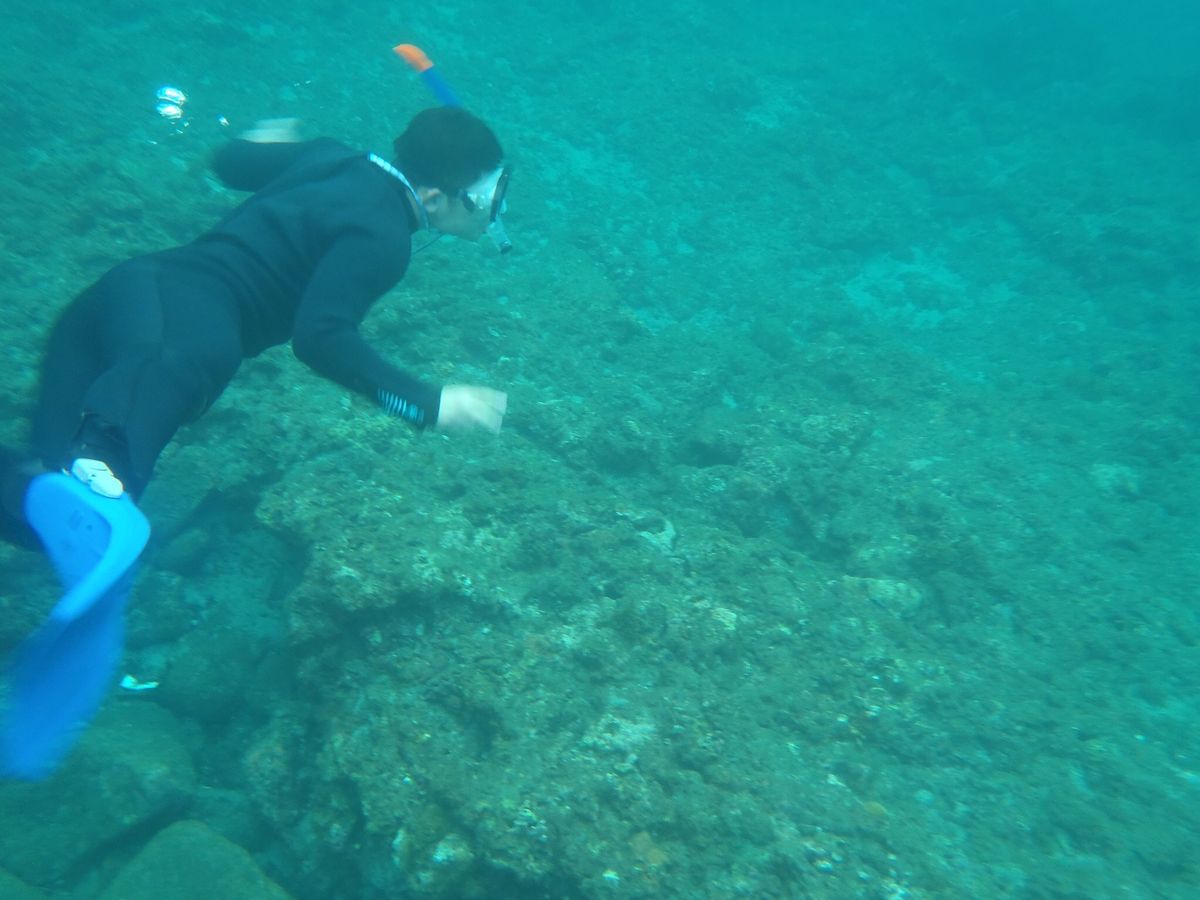 浜辺でお弁当を食べ、きれいな砂浜でチャプチャプしたあと、シュノーケリングのスタートです。屋久島の海はとてもきれいで、様々なお魚を間近に見ることができました。特にウミガメに触りそうになるほどしばらく併走して泳いぐことができたのはとても印象的でした!