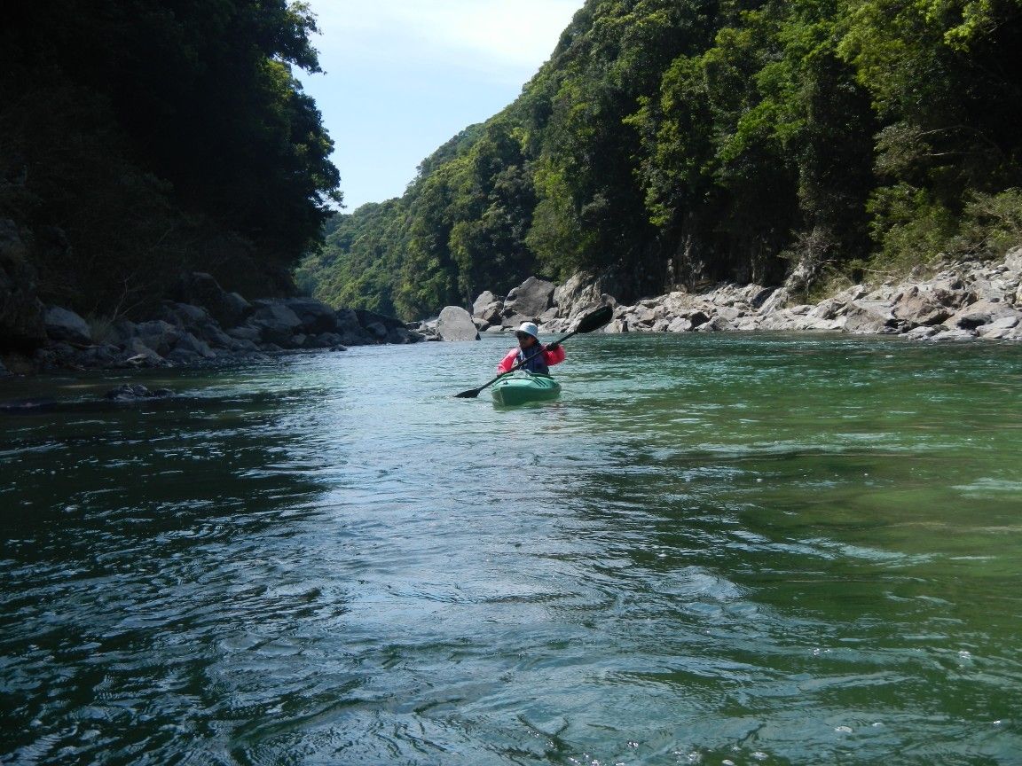 カヤックを漕ぐ楽しさと、上流の綺麗な水場での水遊び、2つの楽しみ方があるリバーカヤックです。