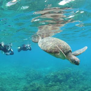 初めてのシュノーケリングでしたが、いろんな種類の魚をみることができ、そしてなにより念願のウミガメには5匹も出会うことができ、一緒に泳ぐことができたのは感動でした!!