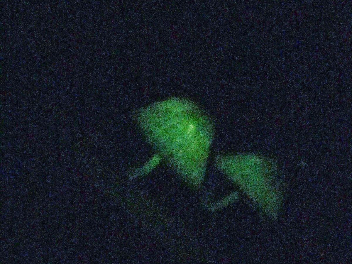 ツアーのスタート時間は星一つ見えない状態でした。真っ暗闇の中、森の中へと移動し、天気が悪いぶん、せめて光るきのこだけでもと目を凝らしていると、しばらくしてようやく暗闇に目が慣れ、光るきのこの姿を捉えることができました。