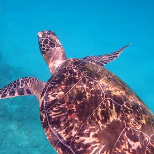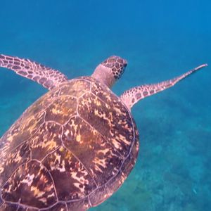 遭遇したウミガメちゃんはゆっくりと一緒に泳いでくれましたね!どこまでもついていけそうな、癒されたひと時でしたね!