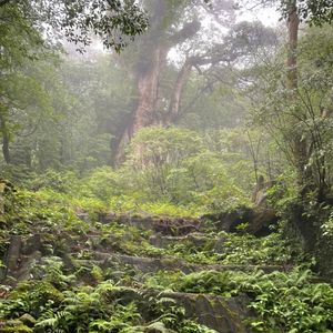 あたりはあいにくの雷雨でレインウェアは上のみを着用してスタートしましたが、苔むす森を経由して太鼓岩に到着する頃には雨は弱まっていました。