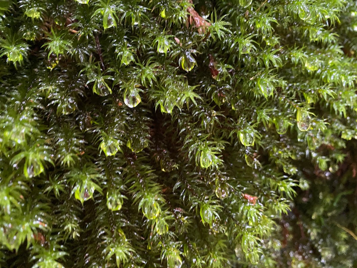 帰り道、霧雨で生き生きしている苔や木々に触れ