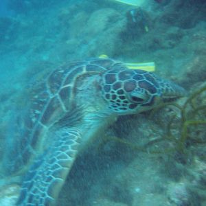 海底に座っていたカメをガイドさんが発見。一緒に泳ぐ夢が叶いました♪