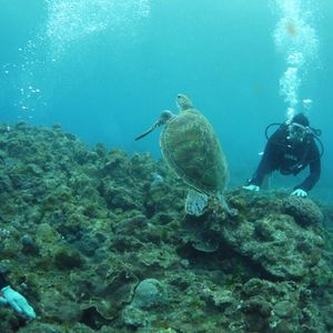 雨を覚悟していたのですが、天候にも恵まれ、とてもいい天気の中、ダイビングをする事が出来ました。水が青く、鮮やかな色の生き物たち、ウミガメにも会う事が出来ました!本当に感動でした。