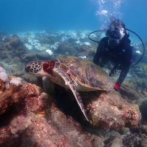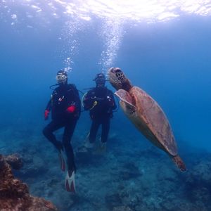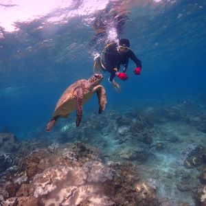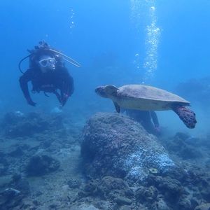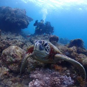 ダイビングは2ダイブを選択しました。1回目は全く潜れなかったのに、2回目は落ち着けたのか潜ることができウミガメにも会うことができました。これも、素人の私に親切に楽しく教えてくださったインストラクターさんのお陰です。
