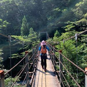 山好きガイドの木下さんと合流し、目的地に到着。準備運動後早速開始、 川の水の流れ、空気と水の美味しさ、霧の中に差し込む日射しが木々の間からキラキラとしてとても綺麗で感動しました。ガイドさんのペース配分でゆっくりと登り、途中で弁当、大好きな味噌汁が山の中でいただけたことが私のエネルギー(ガソリン)となりました。足の痛みもなく太鼓岩まで登れました。太鼓岩へ到着したときはあいにく霧がかかり真っ白で景色は見えなくて残念でしたが登ってこられたという達成感で胸が一杯になりました。山は北と南面とでは景色が全く変わり、苔や杉、滝や岩と自然を満喫できました。順調に下りて来ていたのですが段々と両膝に痛みが出てきて主人に荷物を持ってもらい両手にステッキを持ち歩きました。飛竜橋付近からの階段は一段づつカニ歩き状態でしたがガイドさんが「慌てなくてゆっくりでいいですよ」と声をかけて下さったのでマイペースで最後まで下りてくることができました。
