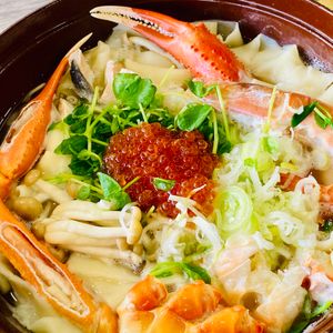 「山梨のほうとう」と言うとカボチャやきのこなど、山の幸が入ったものを想像しますが、ここは蟹や鮭、イクラの入った豪華海鮮ほうとう。