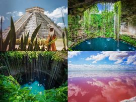 グランセノーテ+チチェン・イッツァ+セノーテイキル+ピンクレイク又はバジャドリード観光 カンクン4大観光地1日周遊ツアー<日本人ガイド/昼食・送迎付き>