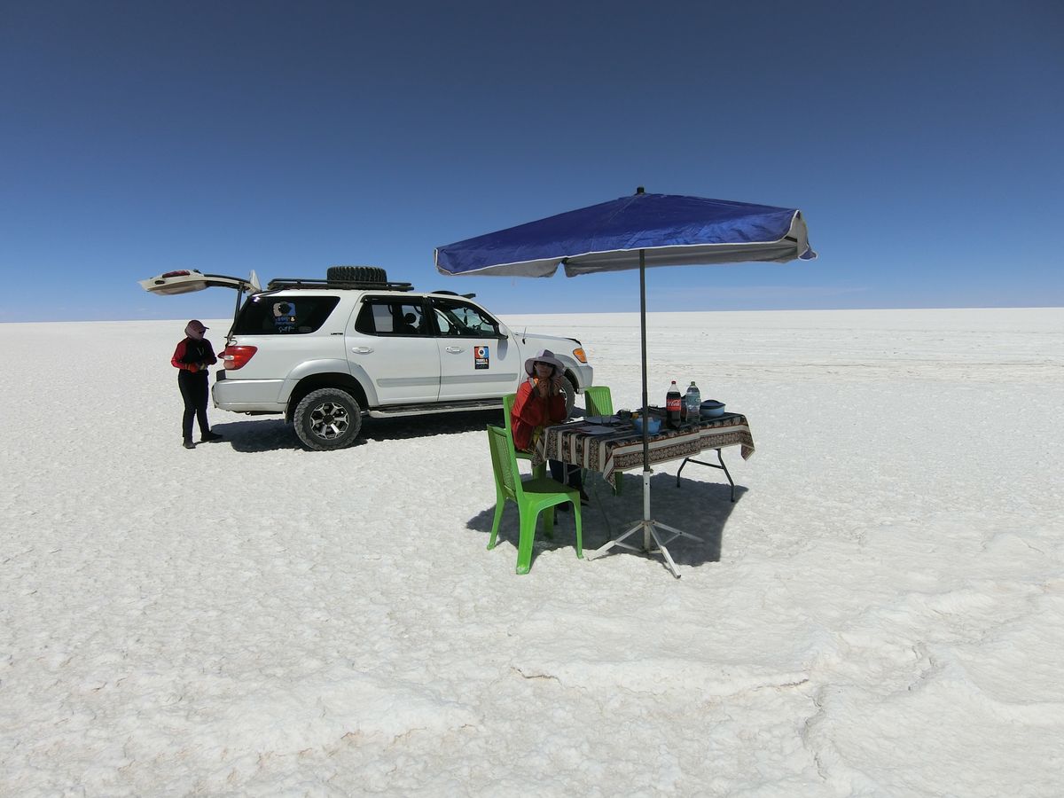 ・お昼がウユニ塩湖の上でのプライベートランチだったこと