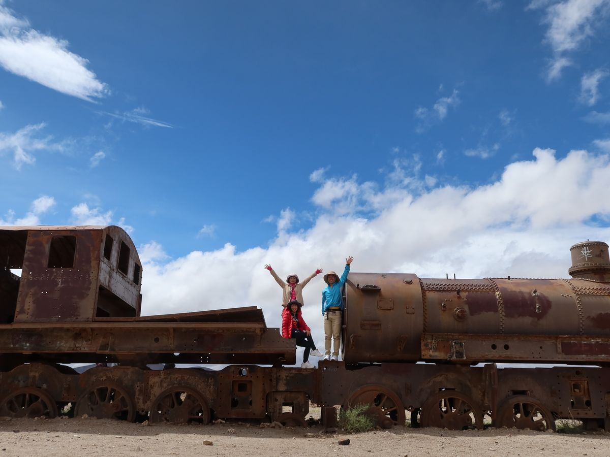 ツアー当日ラパスより飛行機でウユニに向かうが飛行機が遅れるなか如何にかツアー開始の午前10時30分前にホテルに到着する。ホテルにはツアーガイドのナリアが事前に待機して私達夫婦をサポートしてもらう。ツアー開始時間は遅れても大丈夫とナリアからの助言で、ホテルのチェックインと荷物の整理も済ませツアーに余裕をもって参加できた。ツアーには私達夫婦とガイドのナリア、ドライバーのアブラアンの4人で車(ランドクルーザ)に乗り、列車の墓場、塩の博物館、民芸品市場、塩の工場などを観光、その後に私達の車とその他のツア会社の車(4WD)が何台もウユニ塩湖に向かう。ウユニ塩湖の塩原の中へ何台もの4WDが入り疾走する様を目の当たりにして気分が高揚する。その中で私達の車が方向を変え塩湖の中へと向かうと周りは誰一人としていない私達だけの世界に入る。その中で突然訪れた写真撮影(ナリア担当)とランチタイム、車からパラソルが下ろされテーブルと椅子がセット(アブラアン担当)されランチを食べる至福の時間を過ごしました。その後ウユニ塩湖の真ん中にあるサボテンが生い茂るインカワシ島に行き山頂に登りました。妻も高山病の薬を飲みながら息も絶え絶えに如何にか登頂できました。ウユニ塩湖の標高は富士山と同じくらいです。そして最後に乾季の中でも雨水が残っている場所に行き写真撮影とウユニ塩湖の幻想的な夕日を鑑賞しました。ホテルに午後7時30分に到着し、私達の南米旅行最後のオプショナルツアーは最高の想い出として心に残りました。最後にツアーガイドのナリアとドライバーのアブラアンに感謝してるとお伝えください。