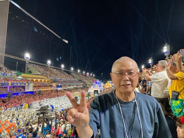 2日目もカーニバル会場近辺は大渋滞でした。前日に続きセキュリティーゲート(男女別々のゲート)を通り抜け階段を上って席へ。席は最前列で最高の場所で大満足。最前列の前が通路になっており上段の人が通路で立ち止まって写真やビデオ撮影をしているとセキュリティーの人達がすぐに注意をして席に戻してくれたので絶えずパレードを鑑賞できました。セキュリティーの人が近くにいることもあってスマホを盗まれる心配もなく皆使っていました。2日目も10時ころスタートしました。1チームに何台もの屋台が繰り出し屋台と屋台の間に何百人(何千人?)もの衣装を着けた人たちが歌いながら踊りながら演奏しながらパレードして通り過ぎて行きました。日本で放映されているピチピチの若い女性ダンサーしかイメージがなかったのですが多くはパレードに参加している老若男女の人達でした。屋台上部のダンサー達とも目が合う高さの席で一体感を感じました。その夜(早朝)も3時まで鑑賞して大渋滞の会場を後にしホテルに戻りました。先日よりも多くの人達が我先にと会場からバスに向かっていました。乗れそびれると1時間待ちです。もしまたリオのカーニバルへ見に来る機会があるとしたら、1日だけ上位に入賞した6チームが見られるチャンピオンカーニバルを2階席最前列で一晩中見るのも良いかなあと思います。一生に一度になるかもしれないカーニバル、来て良かったです。