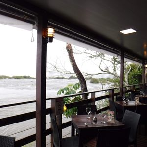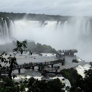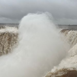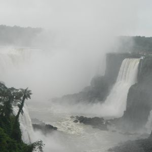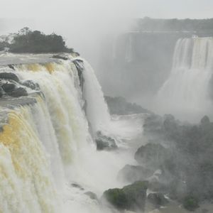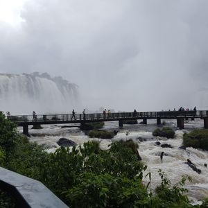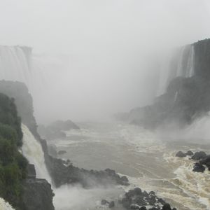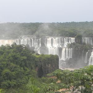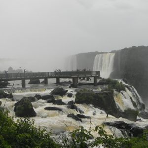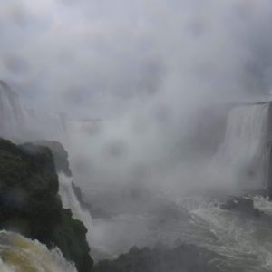 車を動かす関係でガイドさんと途中別れましたが、道は1本だけなので、何も問題はなく、圧巻のパノラマビューを存分に味わいながら、ゆっくりトレックルートを歩くことができました。ところどころ展望&撮影スポットが作られており、角度によって表情が変わる滝のパノラマを楽しむことができます。トレッキングルートの途中でガイドさんと合流し、ブラジル側観光のハイライト、悪魔の喉笛を下から眺める桟橋へ向かいます。桟橋、川の真ん中から眺める滝はやはり迫力があり、水しぶきを全身に浴びてしまいました。国立公園に入る前に買っておいたカッパがとても役に立ちました。悪魔の喉笛の姿は、立ち込める霧ではっきりと見ることができませんでしたが、その存在感は遠くでも感じることができます。