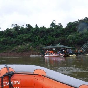 トレッキングが終わった後は、いよいよボートツアーです。ボートツアーの入口は国立公園の入り口側、手前にあるので、改めて道を引き返します。ブラジル側のボートツアーは、森の中を行くジープサファリとセットになっていて、国立公園内の植物や動物の解説もありました。車を2台乗り継ぎ、川面までのゴンドラに乗って、いよいよゴムボートへ乗船。一番前が一番いいとのことで、ガイドさんに取り計らってもらい、一番前の席に座ることができました。ガイド付きの良いところですね。ボートツアーはイグアス川を上流へ向かって進み、まずは滝を一望するスポットで撮影タイムがあります。さっきまで上から眺めていた滝を、川面から眺める感動は、またひとしおでした。