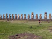 13時頃にイースター島に到着後、15時からツアーに参加することができるので、効率的でした。メインはアフ・アキビの7体のモアイです。空の青と芝生の緑によく映えて、神聖な雰囲気が漂っていました。