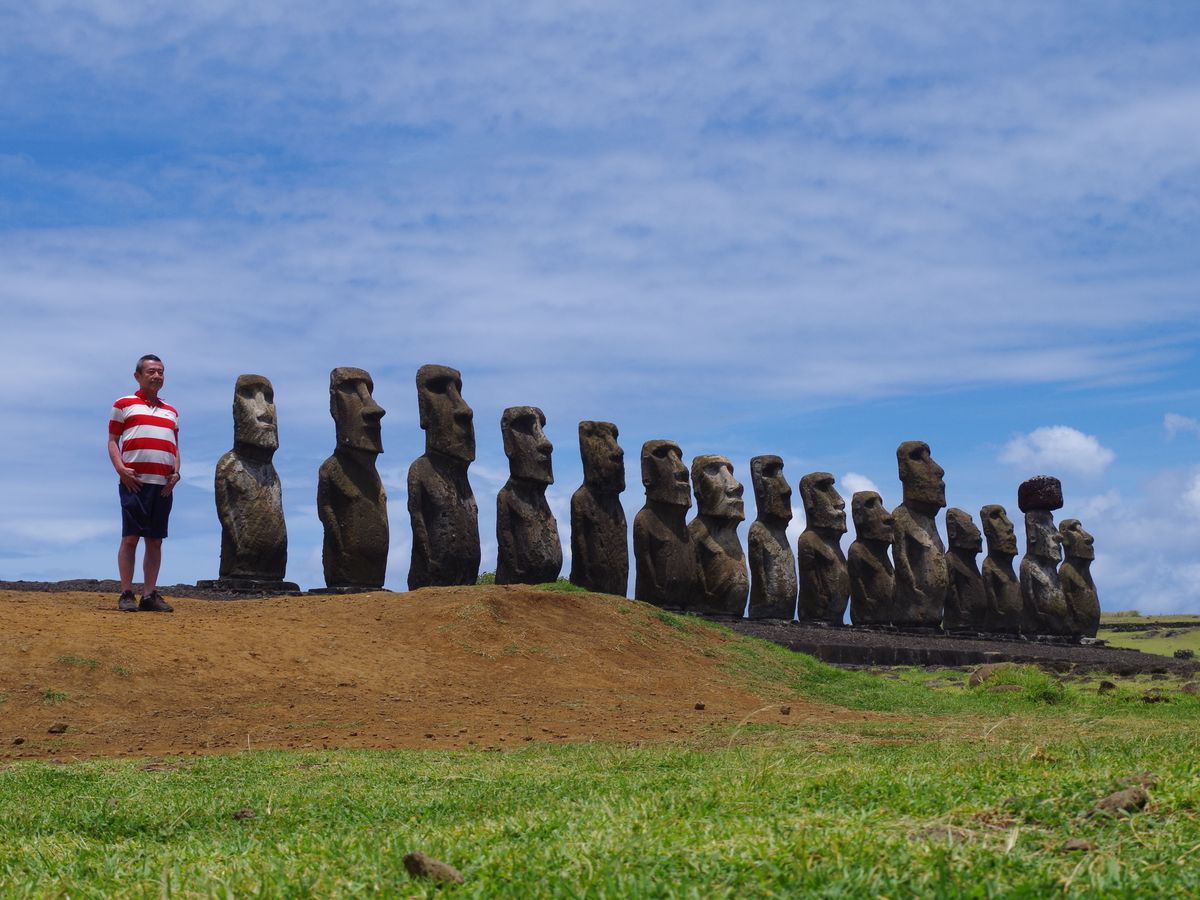 私の心の中を様々な感情が駆け巡る。この気持ちにさせてくれたのもこの時間を過ごしているからだ。じりじりと照り付ける太陽の下、そんな感情が入り混じりすごく大切な時を過ごさせてもらっていた。今日だけではなく5日間この島にいて同じ気持ちの繰り返しであった。あんな大きな岩を何ゆえに十何キロも運ぶ必要があったのか。それよりも何故あの大きさなのか。この土地に足を踏み入れなければ考えない事実である。ガイドの説明もそのあたりを知ってもらいたいのではと思った。岩山でまだ陽を見ることなくほったらかされたモアイ、移動途中で放棄されたモアイ、何を夢見ていたのだろう。ちゃんとした立像よりもそういったモアイの方が多いのだから。倒され壊されてしまったモアイ達もたくさんいる。日本の機械力で海辺にあたかも島を守るように今の我々を見つめる15体のモアイにツアーの終わりに会えた。ガイドは「僕が一番好きなところだ。」と言っていた。モアイ達はやはり何かを言いたそうであった。私が16体目のモアイになりその列に加わったのだが・・・。多くのことを考えられるいいツアーだ。昼食のバーベキューランチを挟んで充実した1日であった。
