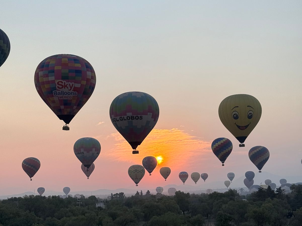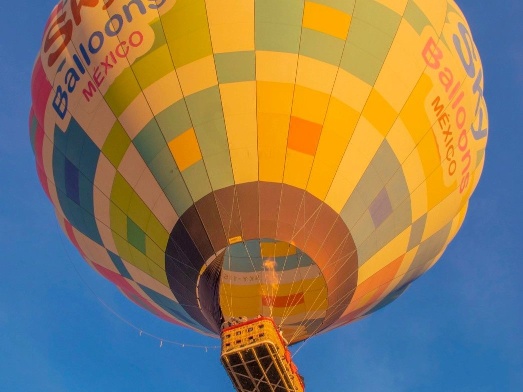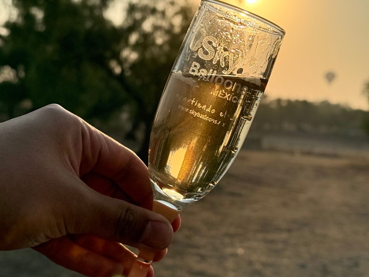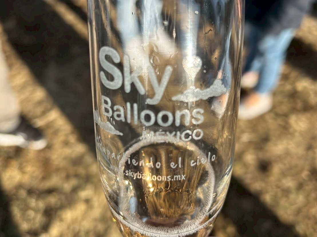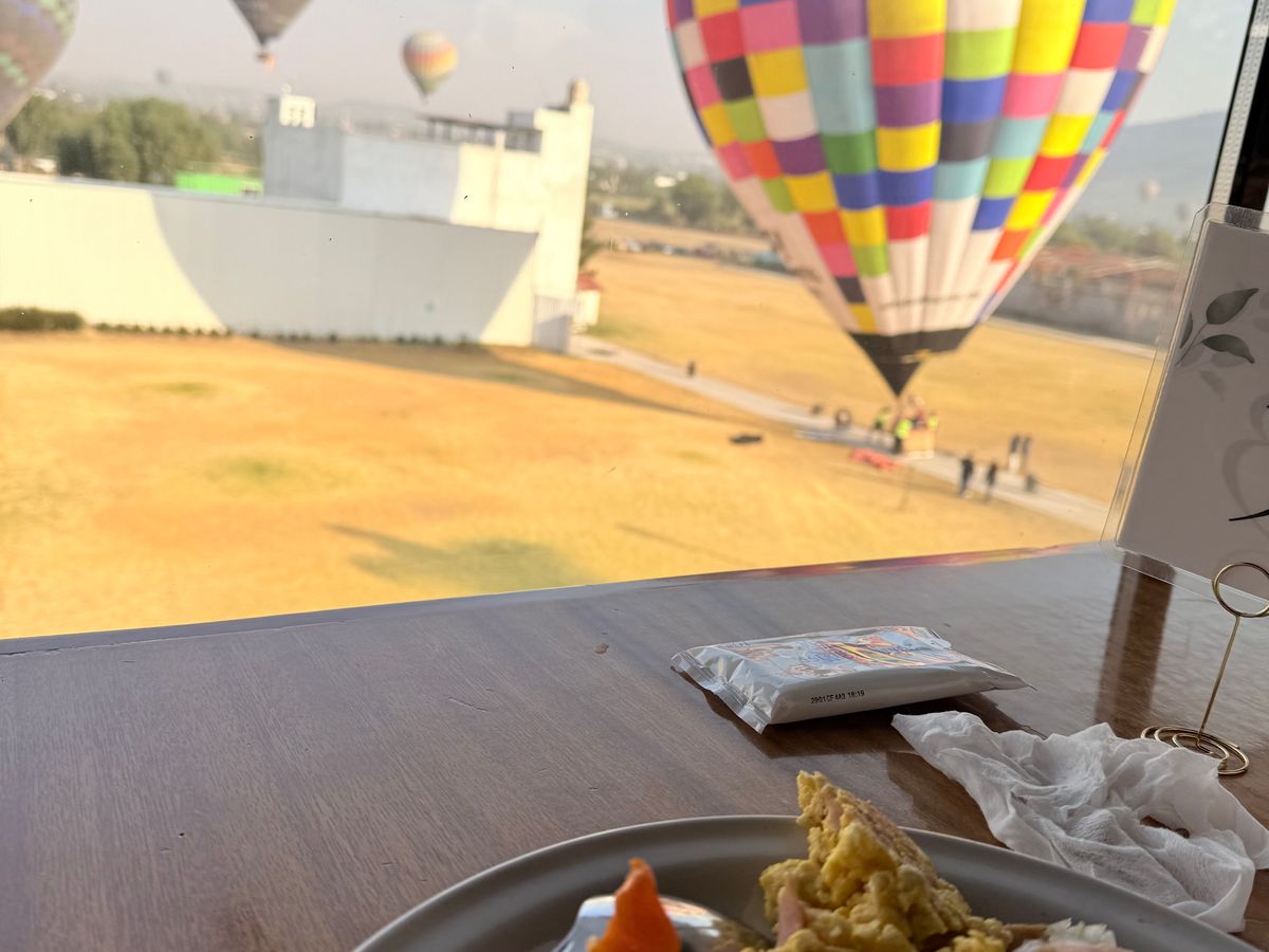 早朝にメキシコシティを出発した時は小雨が降っていて、パーカーに薄手のジャケットを重ね着しても寒かったです。現地に着くと雨は止んでいて、ツアー会社の事務所で温かいココアとおいしいマフィンが出ました。日の出のあと、自分たちが乗る気球の所へ、マイクロバスで移動しました。1つの気球に20人が乗り、ゆっくり上昇しました。気球の炎のおかげか結構あたたかく、素晴らしい眺めを堪能しました。30分ぐらいの空の旅の後、空き地に着陸して、スパークリングワインで乾杯しました。スタッフの方がマイクロバスでお迎えに来てくださり、事務所へ戻って朝ごはんを頂きました。最高に楽しい体験で満足です。