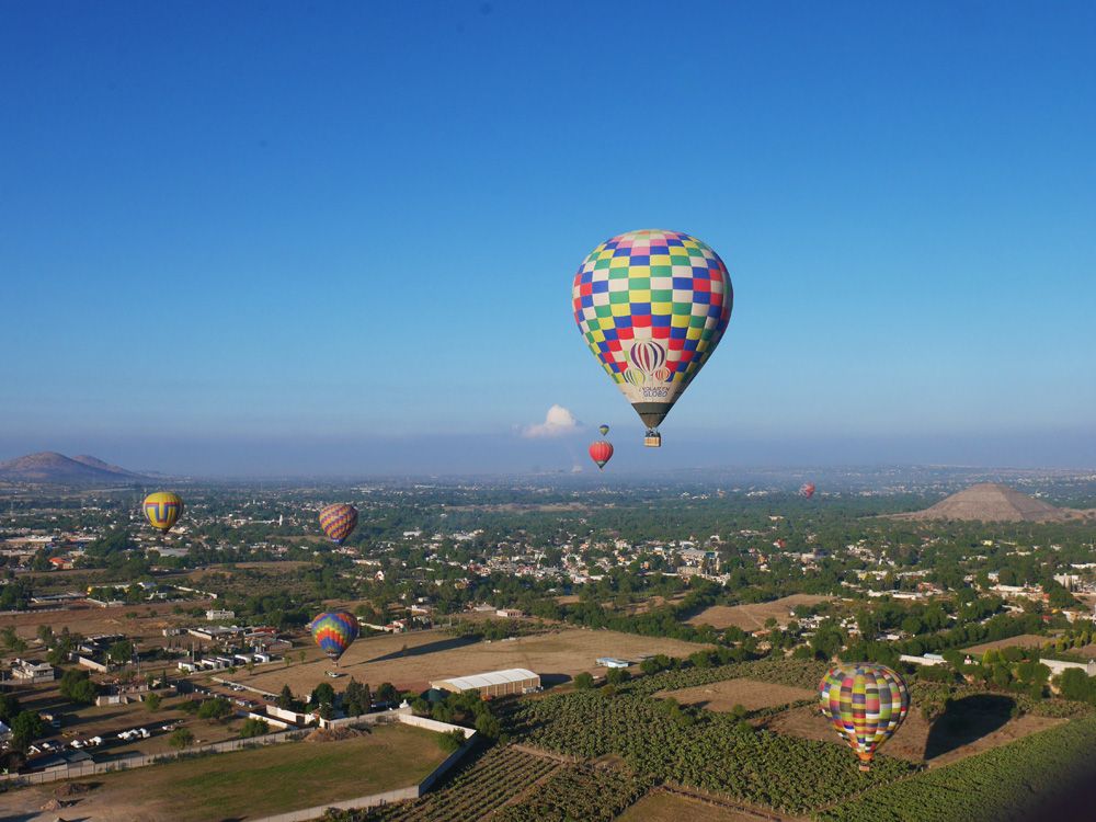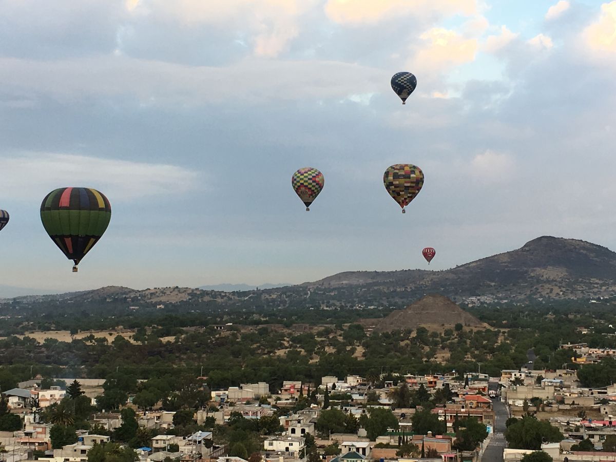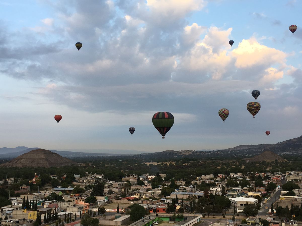 初めて気球に乗りましたが、なかなか味わえない経験なのでとても興奮しました。3月のメキシコシティは、昼は東京の夏並みに熱いので、半パン&Tシャツに長袖シャツくらいの軽装で参加したのですが、気球乗り場に到着すると参加者はみんな薄めのダウンを羽織っていて、間違えたかな?と少し焦りました。でも実際に気球に乗ると、バーナーから発せられる熱のおかげで、凍えることもなく楽しく参加できました。上から見るテオティワカン、たくさんの気球が浮かんでいる景色は、とてもきれいでした。