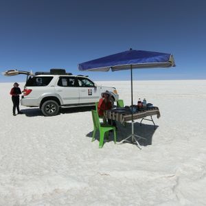 ツアー当日ラパスより飛行機でウユニに向かうが飛行機が遅れるなか如何にかツアー開始の午前10時30分前にホテルに到着する。ホテルにはツアーガイドのナリアが事前に待機して私達夫婦をサポートしてもらう。ツアー開始時間は遅れても大丈夫とナリアからの助言で、ホテルのチェックインと荷物の整理も済ませツアーに余裕をもって参加できた。ツアーには私達夫婦とガイドのナリア、ドライバーのアブラアンの4人で車(ランドクルーザ)に乗り、列車の墓場、塩の博物館、民芸品市場、塩の工場などを観光、その後に私達の車とその他のツア会社の車(4WD)が何台もウユニ塩湖に向かう。ウユニ塩湖の塩原の中へ何台もの4WDが入り疾走する様を目の当たりにして気分が高揚する。その中で私達の車が方向を変え塩湖の中へと向かうと周りは誰一人としていない私達だけの世界に入る。その中で突然訪れた写真撮影(ナリア担当)とランチタイム、車からパラソルが下ろされテーブルと椅子がセット(アブラアン担当)されランチを食べる至福の時間を過ごしました。その後ウユニ塩湖の真ん中にあるサボテンが生い茂るインカワシ島に行き山頂に登りました。妻も高山病の薬を飲みながら息も絶え絶えに如何にか登頂できました。ウユニ塩湖の標高は富士山と同じくらいです。そして最後に乾季の中でも雨水が残っている場所に行き写真撮影とウユニ塩湖の幻想的な夕日を鑑賞しました。ホテルに午後7時30分に到着し、私達の南米旅行最後のオプショナルツアーは最高の想い出として心に残りました。最後にツアーガイドのナリアとドライバーのアブラアンに感謝してるとお伝えください。