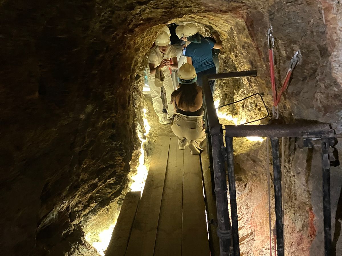 鉱山見学では、ホテルの下に鉱山があるということで、びっくりしました。実際にダンスホールからエレベーターで降りていきましたが、昔の方もこれを実際に利用していたんだと思うと、震えが止まりませんでした。ヘルメット着用でしたが、清潔なヘッドカバーをつけて、ほかの方の使用感はなくて、快適でした。ただし、気を抜くとヘルメットに岩盤が当たってしまったのは、ご愛敬。それもまた、楽しい体験でした。鍾乳洞をめぐる体験はいろいろとしましたが、鉱山の坑道を実際に歩くという大変は似ているようで、まったく違って、興味深かったです。