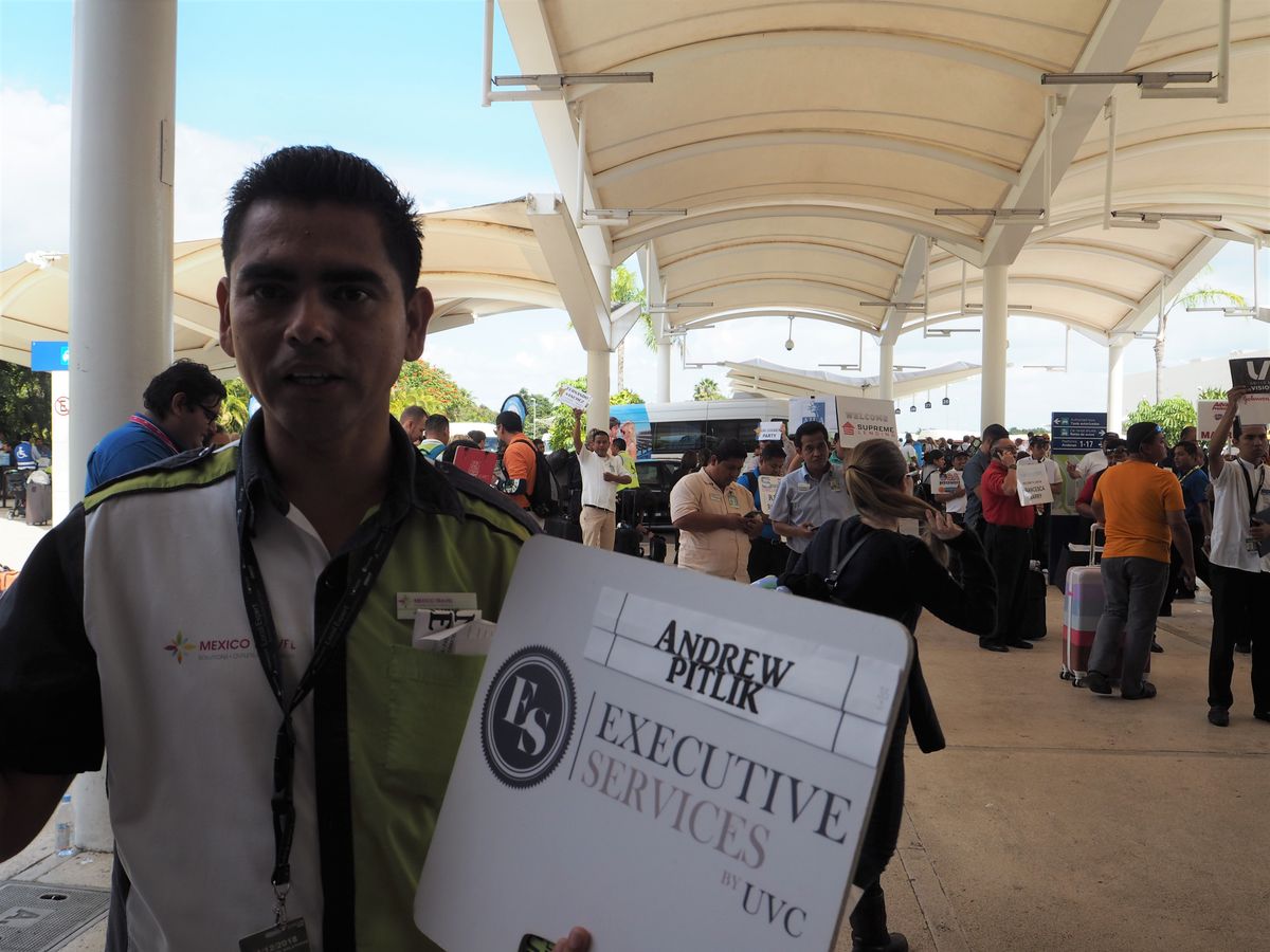 「お出口にてスタッフが「Mexico Travel Solutions」と書かれたボードを持ってお待ちしています。 ※「Mexico Travel Solutions」のスタッフは、白と黄緑のTシャツに黒いズボンを着用しています。」