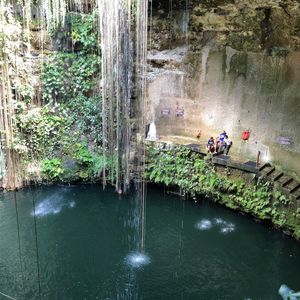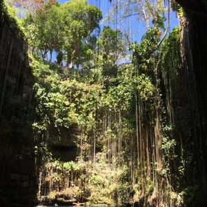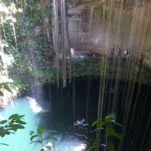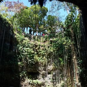 グランセノーテは水の中が美しいですが、セノーテイキルはその形が面白いです。大きい丸井戸のような形で、上から植物の根が垂れ下がり、光が差し込んでとても美しいです。暑かったので、いいクールダウンとなりました。