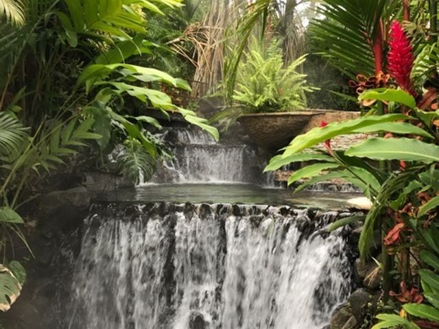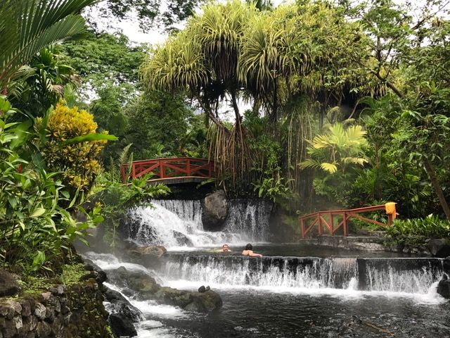 アレナル火山は離れた展望台から眺めるだけで近くまで行けなかったのは残念でしたが、タバコンリゾートはジャングルの中に温泉があるような感じでとても良かったです。温泉の時間は十分に取られていて、慌てることなく心ゆくまで楽しむことができました。ロッカーと大きなバスタオル1枚の貸し出しは料金に含まれています。ロッカーはあまり大きくないので、使わないものはバスに置いておき、必要なものだけ持って行った方がいいです。昼食は団体客しか利用していないような食堂風のところでしたが、夕食はタバコンリゾート内のビュッフェレストランでメニューは充実していました。