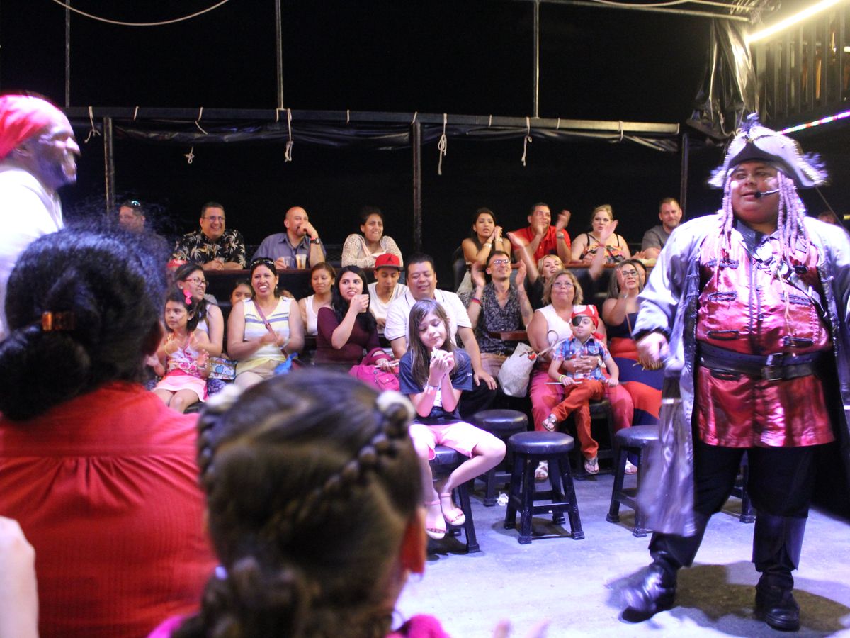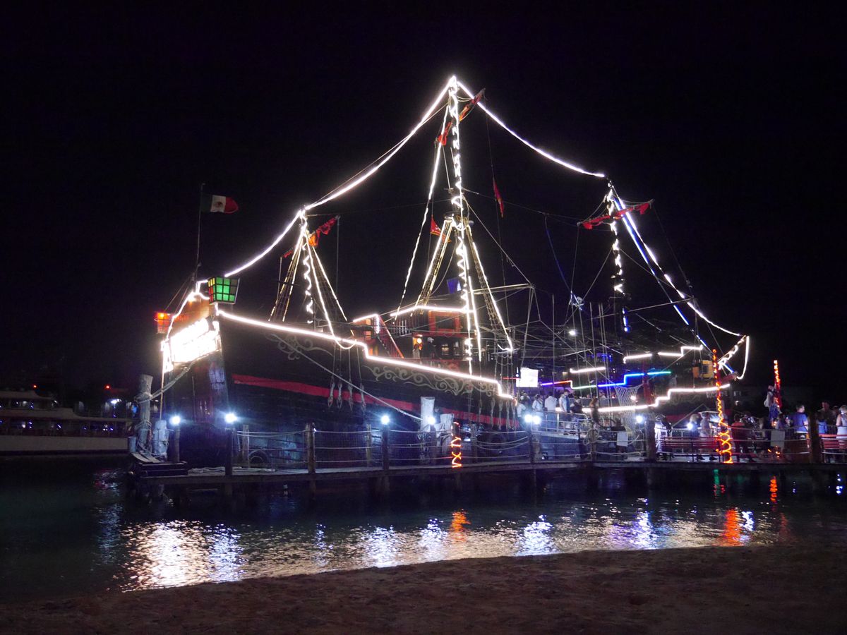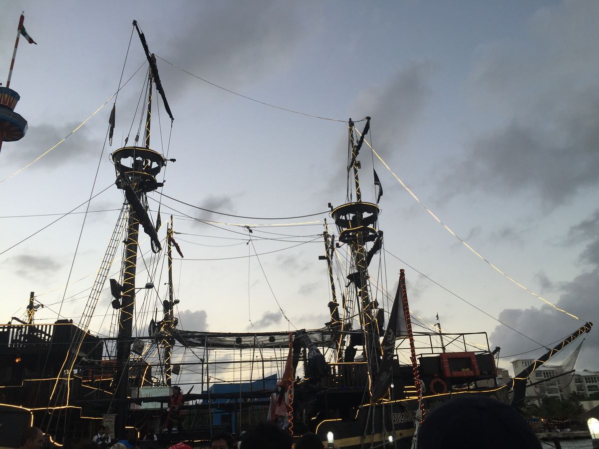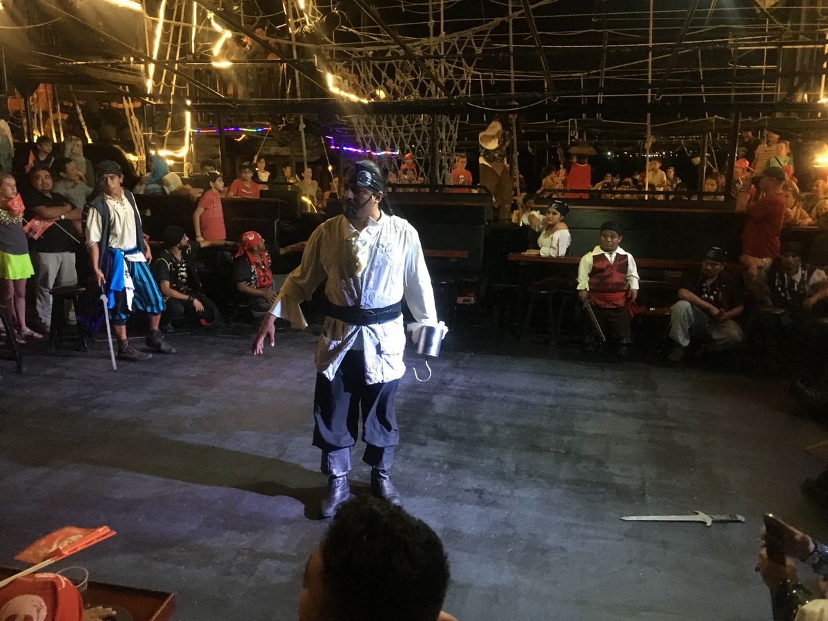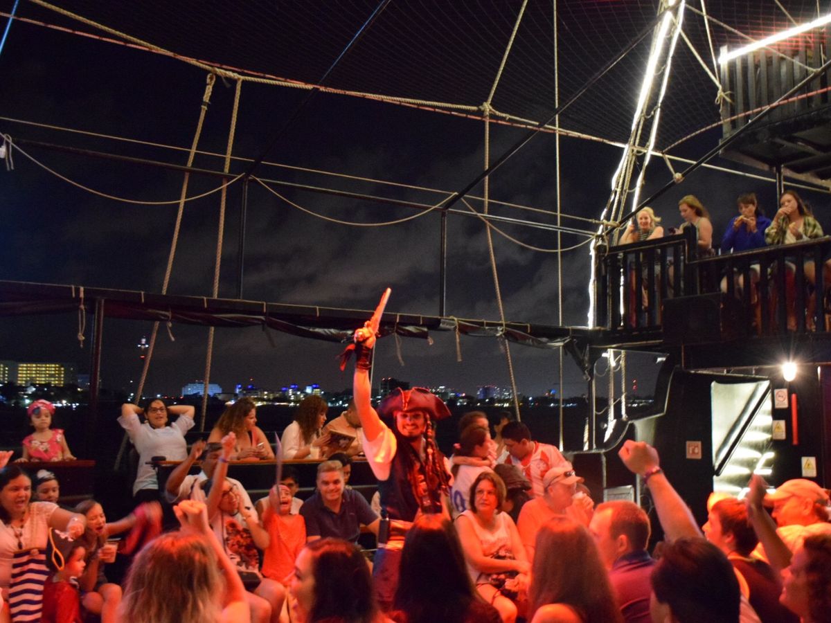 カンクン1日目の夜に参加しました。バウチャーからチケットを交換し、海賊船へと向かう間にも雰囲気のある海賊の像がたくさんあり写真をたくさん撮らせていただきました!準備中の海賊船の付近では海賊の方がペイントをしてくれたり、笛合戦でお客さんを楽しませたりと待機時間も飽きないような工夫がされていました。私達はとりあえず$5のバケツビール(ビール4本とナッツ類)を購入し乾杯しました。最初に海賊船を見た時は船の形をした建物だと思っていたので、船が出航した時の興奮は凄かったです。海賊船で働く1人の方とペインティングと彼が日本語を学んでいることをキッカケに仲良くなり、パフォーマンスの際にはたくさんイジっていただきました(笑)彼はアクロバットのパフォーマンスもしていて、船の一番上からロープ一本で宙吊りになったりしてとても迫力があり大興奮でした!アジアからの客が私と彼だけだったのもあり、周りのお客さんからも遠いところから来たね!と、とても気さくに話しかけてくれたり、ダンスを教えてくれたりと本当に楽しかったです!お客さんがたくさんいるので、順番にご飯を食べる部屋に案内されるのですが、段取りよく案内されるし、パフォーマンスは続いてるので待っているという気分にはならなかったです。ステーキもボリュームがあり柔らかくとても美味しかったです。ステーキ以外はバイキング形式になっていたので大食いの彼氏も大満足そうでした。またドリンクもなくなったらすぐに海賊の方が次のドリンクを聞きに来てくれるので良かったです。