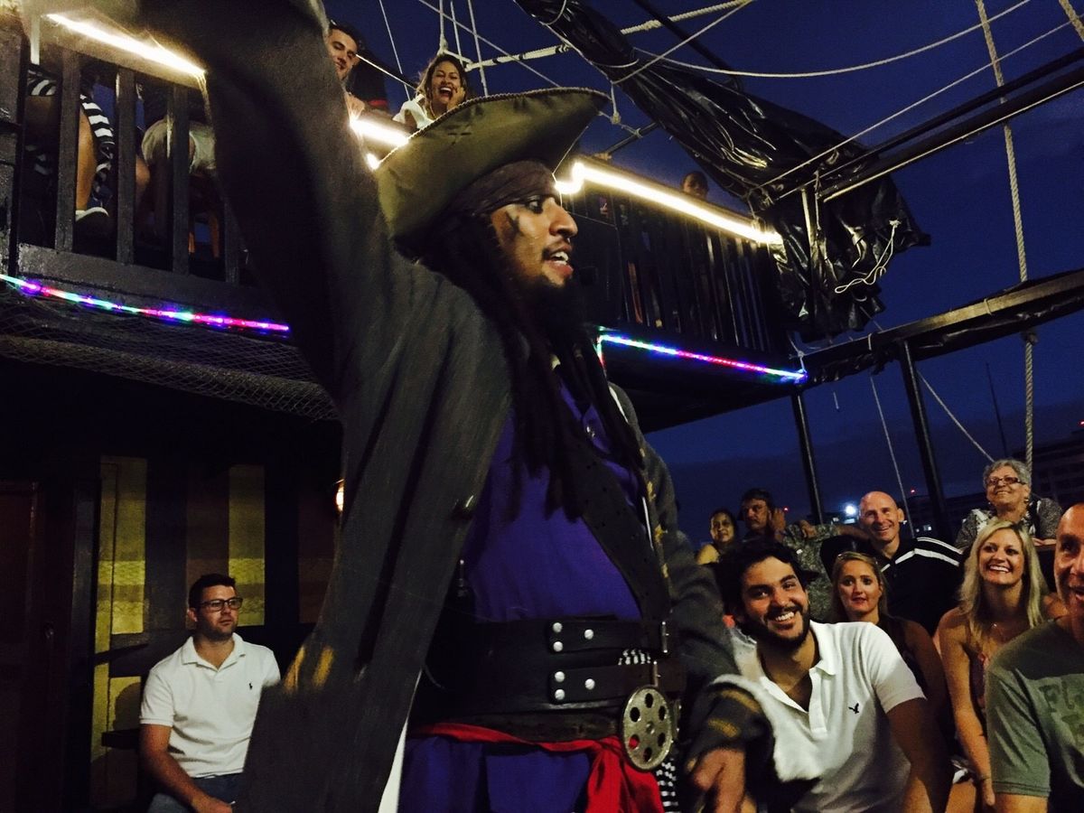 オアシスパームで現地集合だったため、ホテル中心部からタクシー10ドルで到着。タクシーから降りると海賊のおむかえがあり、すぐに案内してもらえました。バウチャーを分かっておらず、印刷した紙をもっていくとノーバウチャーと言われ、乗船の危機でしたが、あちらでなんとかしてくれてなんとか乗船。最初はショーから始まり、国いじりやゲームが始まりました。日本語を話せる海賊がいるとのクチコミで安心していましたが、どうやら乗った船にはおらず自分の英語力で乗り切るしかなく雰囲気で楽しみました。船が3台くらい出ていたので、違う船にその海賊がいたのかもしれません。船長がそれぞれおり、ジャックじゃなかったことがちょっと残念でした。ショーを見ている間にもちょこちょこ海賊がドリンクのお世話をしてくれて、飲み物に困ることはありませんでした。途中でご飯を食べるため、海賊に連れられ場所を移動してお食事。戻ってくるとダンスタイムになっていました。海外の方はみんな踊りがうまく、楽しんで踊っていましたが、踊りなれていない私は最後の方はすみっこでゆっくりフィナーレの花火を見ました。なかなか出来ない体験をすることが出来、貴重な思い出になりました★