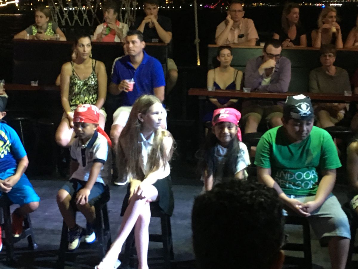そんな和気合いとした中、船は出航し、私たちはまさかの1Fのステージ1番前の席に。ショーはスペイン語を中心に進んで行きますが、英語も交えながらなので、なんとなくニュアンスで理解できるかと。飲み物はクルーに注文し、席に持ってきてもらえます。マルガリータが美味しく、お酒が強い方にはオススメです。ここの体験談にも書いてあるとおり、日本人はとにかくイジられます笑。キャプテンに日本人とバレてから、『スシ、サムライ、アリガトウ‼︎』などの片言の日本語で、フレンドリーにイジられ、会場のみんなにも『ここに日本人がいるぞ‼︎』と頼んでもいないのに紹介までしてくれました笑。そのイジられついでに、ちょっとしたゲームにも選ばれ、参加することに。普段あまり外国の方と競い合うことがないので、お酒の力もあり、とても興奮しました。