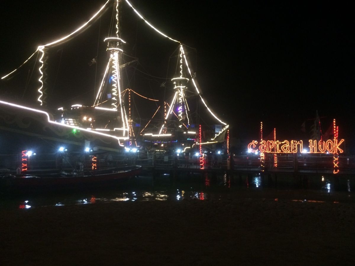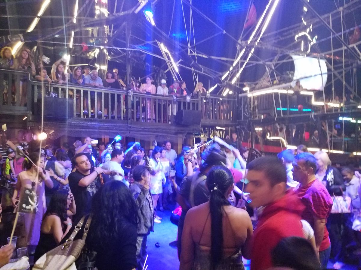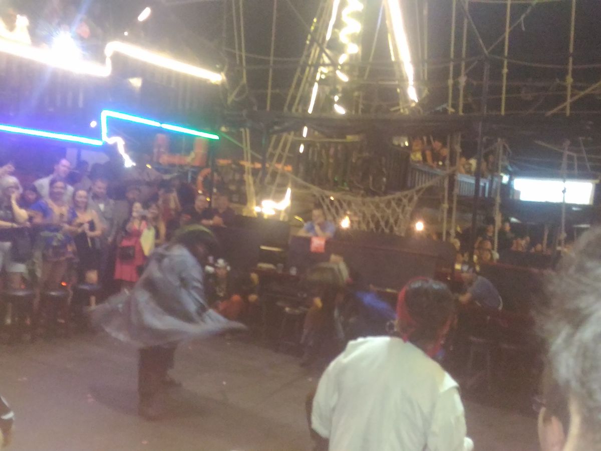 ディナークルーズといってもご飯はおまけみたいなものでした。とにかくみんなノリが良いし、踊って踊って踊りまくる感じでした。アジア人は私と友達の二人だけで、とにかくいじられっぱなしでした。半ば強引に全員の前で踊らされたけど、それも良い思い出です。英語とスペイン語で進められるのですが、わからなくても楽しめます。フック船長とジャック・スパロウ船長の船があって、私たちはジャックのほうに乗りましたが、多分内容はあまり変わらないのだと思います。