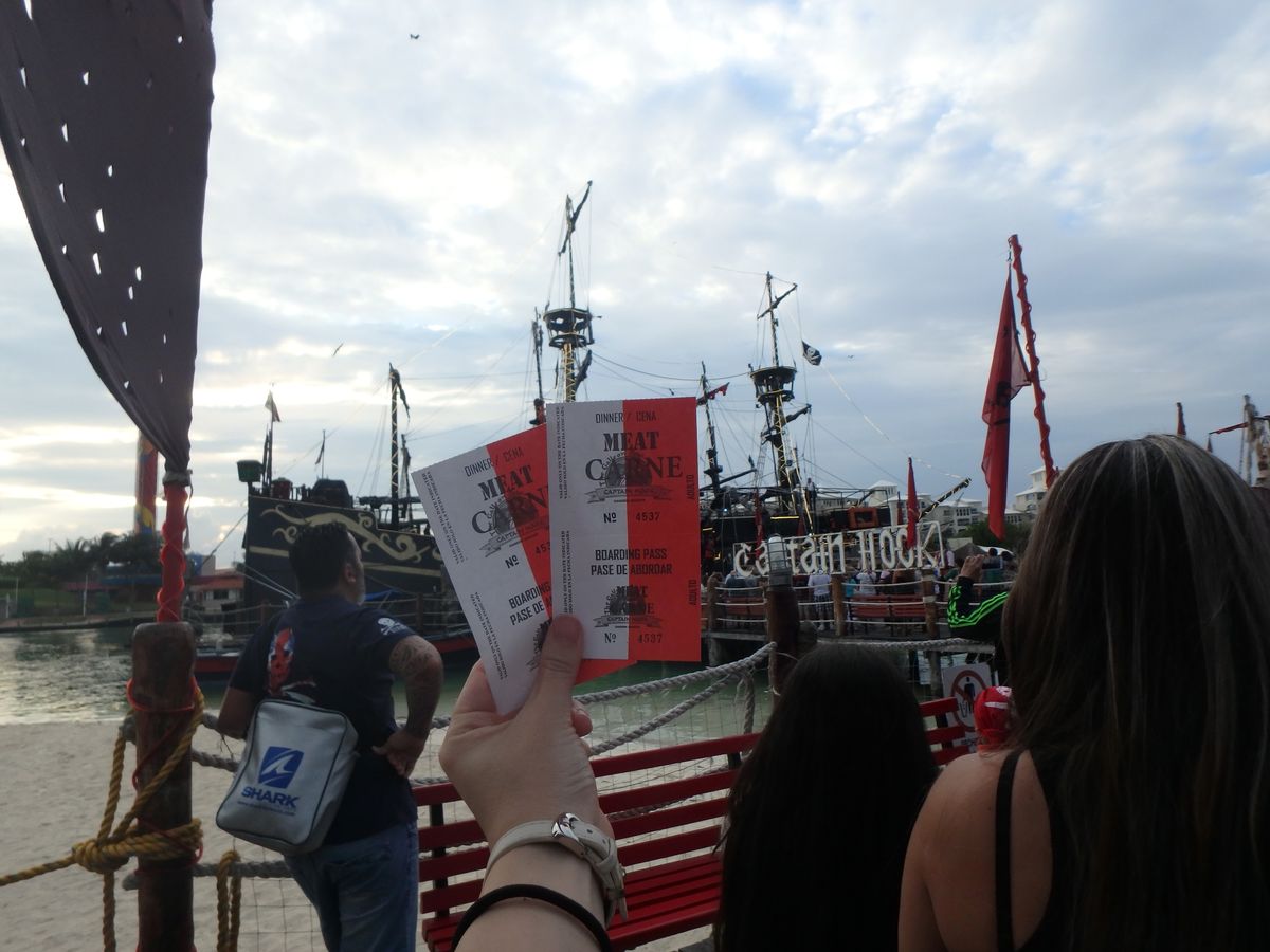 宿泊したホテルが集合場所であるオアシスパームホテルから離れていたので、定額料金(一人10.5ペソ)のバスを使用して向かいました。バス内ではアナウンスがなく、慣れるまではどこを走っているか常に注意が必要ですが、タクシーを利用するよりはかなり割安で移動できるのでお勧めです(近くなったら自分でボタンを押して止める必要があります)。バス停から集合場所までは近く、バスを降りてから30秒程度で到着できました。すると海賊のお迎えがあり、すぐに案内してもらえました。バウチャーをチケット売り場で渡すとチケットを受け取ることができ、船乗り場まで1~2分程度歩きます。出発時間が近づくと海賊達が乗客をあおり、場を盛り上げます。人数によって船数が異なるようで、私たちの時は乗客は2船に分かれて乗っていました。私たちはフック船長がメインスピーカーの船でした。乗船後すぐに写真を撮ったのち(写真の受け取りは有料です)、出航します。最初は海賊のショーから始まり、その後フック船長による乗客と対話(どこの国から来たか、ハネムーナーか、などを聞かれました)が始まると、その流れでゲームが始まりました。東洋人客が少ないせいか、皆様の口コミに記載の通り、日本人は確実にいじられますので覚悟しておいてください。私の場合は1階(海賊たちがパフォーマンスする場所と同じ)に座るよう誘導されたので、いじられるのが嫌であれば2階に行きたいと話したほうがよさそうです。私の場合はゲーム(4人によるビール一気飲み、ダンス対決)にも呼ばれました。ゲーム終了後、再度海賊たちのショーになりますが、途中でご飯を食べるため、海賊の誘導に沿ってブッフェスタイルのお食事をします。私はステーキをチョイスしましたが、ステーキは肉の味もあり柔らかく、おいしかったです。食事を終え席に戻るよう誘導されると、デザートを席まで運んでくれました。乗客全員が食事を終えると、ダンスタイムが始まります。最初はフック船長がMCのダンスでしたが、段々クラブミュージックによるダンスに移行します。ダンスタイムの間に他の船の海賊と自分の船の海賊の戦うショーが行われます。ダンスタイム終了後に解散、という流れになります。