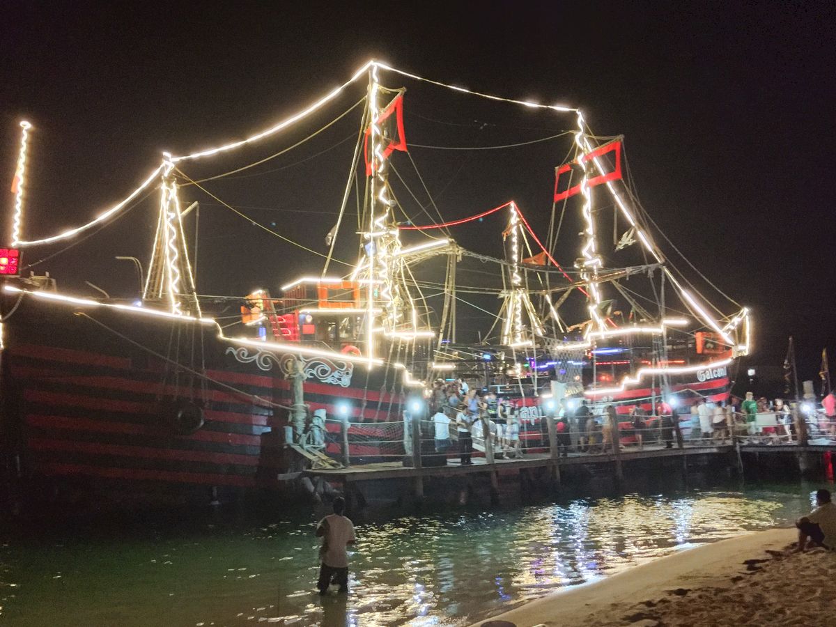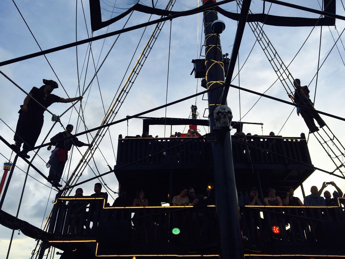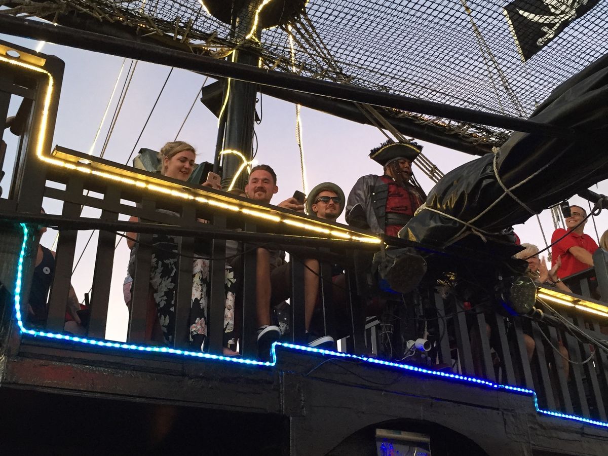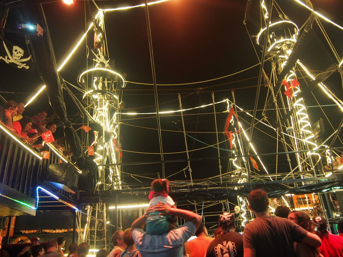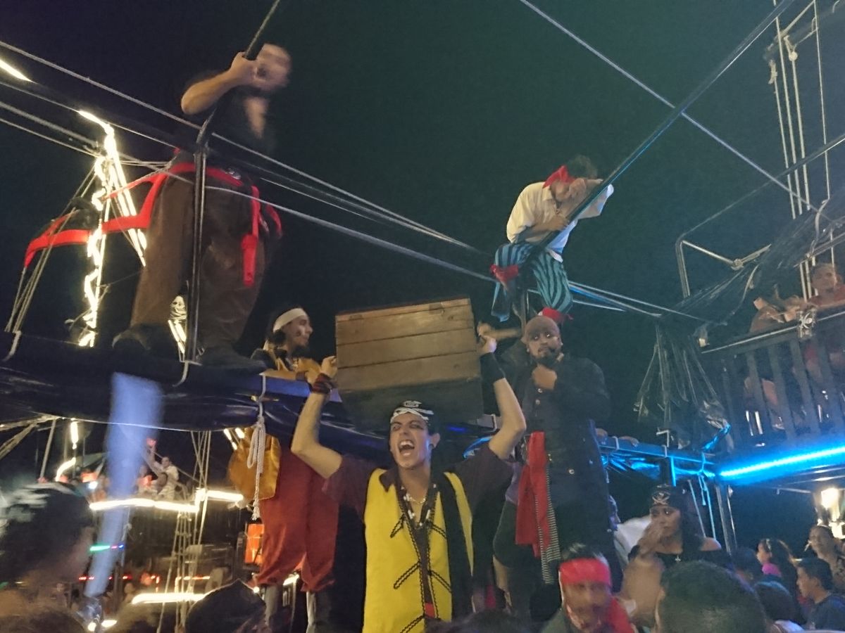 ハネムーンの旅行にて参加しました。会場ではたくさんの海賊たちが出迎えてくれて、顔や腕にペインティングもしてくれるのでテンションがあがります。その時に声をかけてくれたブラジル人夫婦がとても素敵な人たちで、英語がほぼしゃべれないもののそのご夫婦と一緒に行動しました。船上ではフリーでお酒を飲みながら参加型の催し物を見るという感じです。人数もけっこういて船上はぎゅうぎゅうです。日本人の観光客の方が指名されてダンスを踊り会場を盛り上げていました。肝心の料理はどこで食べるのかと思っていたら船の下に順番に呼ばれて食べ次第また上に上がるという流れでした。狭いので仕方ありませんが、ショーを見ながらというわけではなく、そこは残念でした。私たちはチキンを食べましたが、味は普通ですがボリュームはありました。最後に海賊の戦いがあり、それはけっこう迫力があります。そのあとはダンスタイムでクラブのような雰囲気でした。全く踊れない私たちは遠くで見ていましたが、ブラジル人ご夫婦がダンスを教えてくれたおかげで一緒に楽しめました。というか、このご夫婦が色々世話を焼いてくれたおかげで一通り楽しめたといっても過言ではありません。クラブが好きな方にはおすすめです。