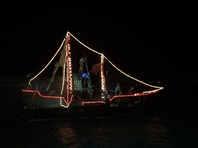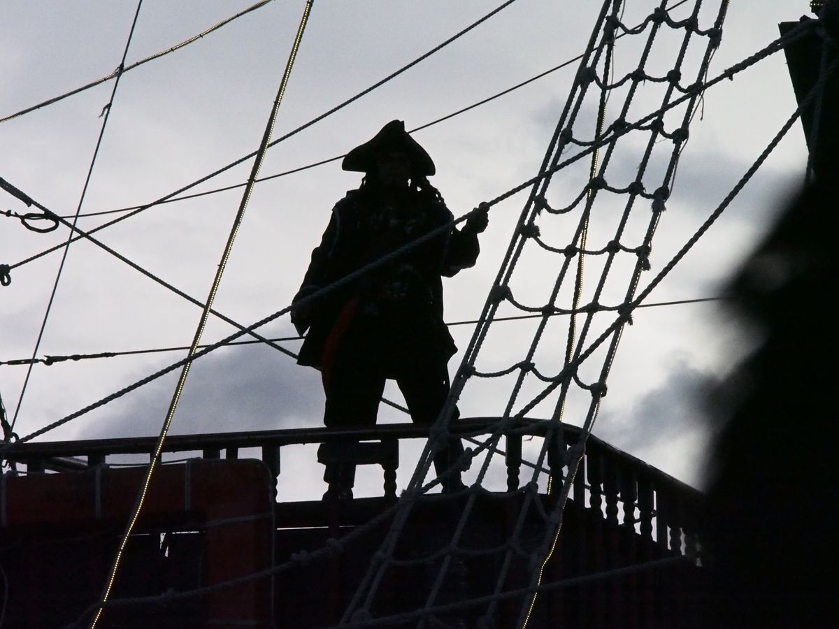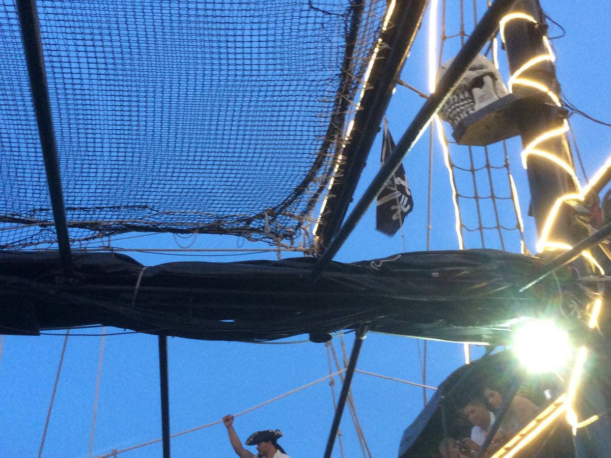 夕方の18時すぎに港に集合し、船に乗り込みます。港のまわりには、海賊っぽい飾りつけや海賊の像があったりと気分を盛り上げます。