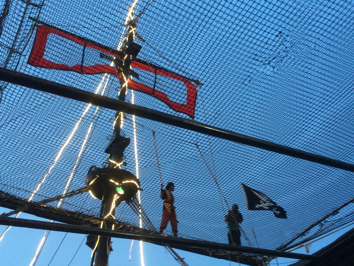客の盛り上げから、ウエイター、雨しのぎ、アクロバット、よく働く海賊だなという印象。笑