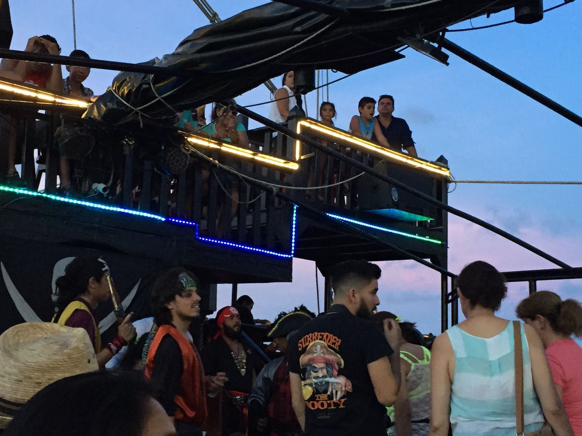 友達と2人で参加してきました。予想以上に楽しいクルーズでした。軽く海賊のショーを見てディナーを食べて終わりかな…くらいに思っていましたが、最初から最後まで内容が盛りだくさんで、退屈する時間が一瞬もありませんでした!まず、船に乗り込んで海賊たちとの写真撮影。その後は飲み放題のカクテルを楽しみました。飲み放題なので、クォリティはそこまで期待していなかったのですが、ピニャコラーダやマイアミバイスなどのフローズンカクテルなとも本格的でめちゃくちゃ美味しかったです!カクテルがなくなるタイミングを見計らってクルーの方が新しい飲み物を持ってきてくれるのも良かったです!なかなか激しい海賊のショーは子供だけでなく大人も楽しめる内容です。アジア人が私と友達しかいなかったので、ショーの進行役の海賊にかなりイジって貰えたのも楽しかったです。ショーをしっかり楽しんだ後はステーキディナー。ここでも、味は期待していなかったのですが、とんでもない‼︎ すごく柔らかくてジューシーなステーキにサイドメニューも充実していて最高のディナーでした!そして、ここからが凄かった!他の海賊船が近づいてきて、なんと、向こうサイドの海賊が私たちの船に乱入!戦いのショーも間近で見れます。もちろん、私たちの船の海賊が相手側の船に乗り込んでの戦いもありました。本格的すぎてビックリ!そこで終わるのかと思いきや、今度はまるでクラブのようなダンスタイムが!大音量のラテン音楽が流れる中、乗客が一つになって踊る感じが最高でした!子供から年配の方達までラテンのリズムに乗って踊るのに混じって、私と友達もノリノリで踊ってしまいました!たまには贅沢したいね、と友達と参加したツアーでしたが、贅沢どころか、この値段では安すぎるくらいです!盛りだくさんで大満足しました!子供だけでなく大人も楽しめるツアーなので、カンクンに旅行する方たちには本当にオススメだと思います!